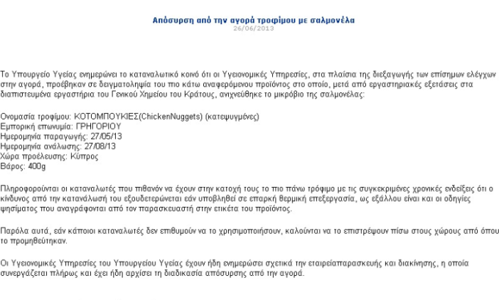 Αναφορικά με το πρόβλημα που προέκυψε με την ανεύρεση σαλμονέλας στο προϊόν μας Chicken Nuggets 400g, ημερ. 27/05/13 - 27/08/13, θα θέλαμε να σας πληροφορήσουμε ότι ήδη έχουμε προχωρήσει σε άμεση απόσυρση του προϊόντος από την αγορά.