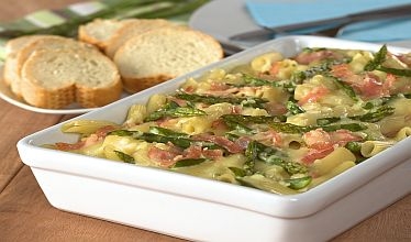 Βράζετε τις πένες σε άφθονο αλατισμένο νερό και σουρώνετε. Τις περιχύνετε με τη σάλτσα, ενώ προσθέτετε από πάνω λίγο βασιλικό και παρμεζάνα. Γαρνίρετε με τις κορφές των σπαραγγιών και σερβίρετε.