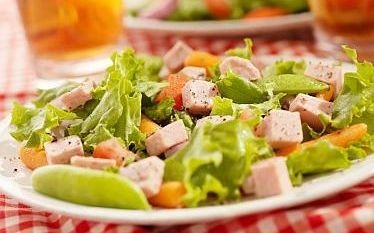 Μοιράζετε τα φύλλα της σαλάτας σε 4 πιάτα ή τα βάζετε σε μια μεγάλη πιατέλα και προσθέτετε πάνω τα αβγά, τις πατάτες, τις ελιές, το ζαμπόν, το αβοκάντο και τα ντοματίνια.