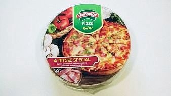 Συσκευασία με 4 ατομικές πίτσες σπέσιαλ (ζαμπόν, μπέικον, τυρί, σάλτσα ντομάτας, μανιτάρια, πράσινη πιπεριά)